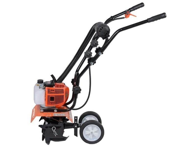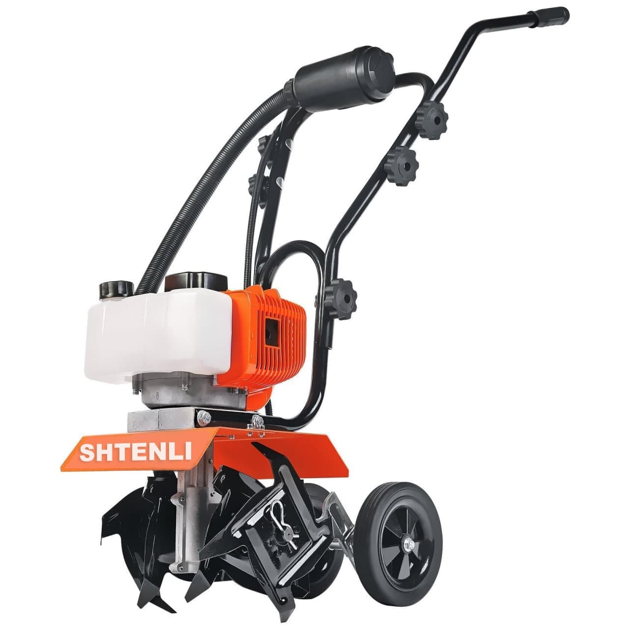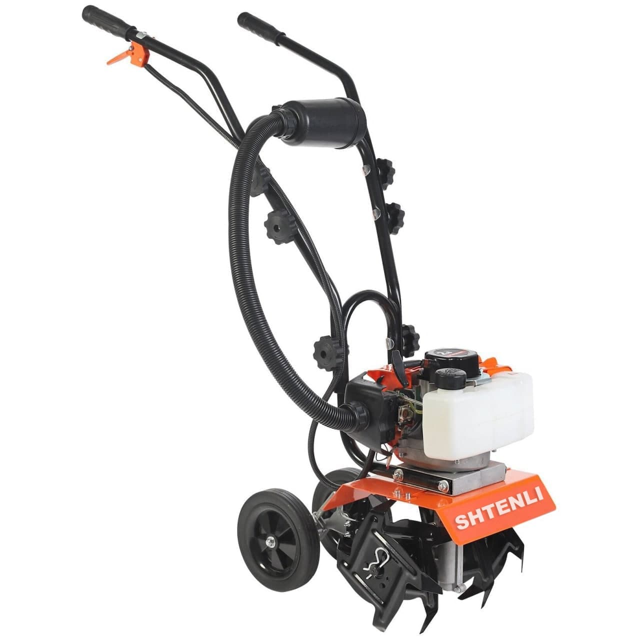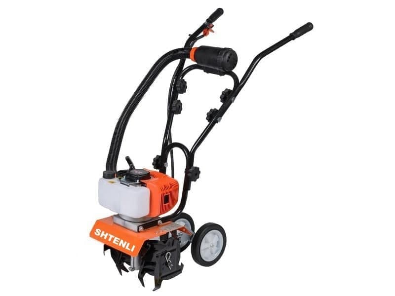 Если вы задумываетесь о приобретении мини культиватора и рассматриваете электрический культиватор или бензиновый вариант. То мы хотим рассказать о преимуществах бензиновой техники. Прежде всего бензиновый культиватор Shtenli 2000K2NS мощнее любого электрического. Мощность Shtenli 2000K2NS 3лс или 2,2кВт, при том, что самый мощный электрический 1700 кВт. Вес бензинового культиватора 14 кг, что практически совпадает с электрическим культиватором. Ширина обработки Shtenli 2000K2NS регулируемая 26см и 18 см это дает возможность проходить самые узкие междурядья. Максимальная глубина вспашки 22см, что практически совпадает с размером лопаты. При этом вам не будет мешать кабель удлинителя, который может поломать растения. Так же мини культиватор очень удобен на коротких рядках, его легко разворачивать в отличии от тяжелых мотоблоков. Shtenli 2000N очень прост в транспортировке. Если сложить ручку, он помещается на багажник велосипеда не говоря уже о багажнике автомобиля. Можно даже поставить его в сумку и повезти в электричке. Работать с культиватором легко т.к. он не сильно тянет оператора за собой, это намного легче, быстрее и проще чем обрабатывать поле тяпкой. Он очень хорошо выбивает сорняки, а за счет его малых размеров ходить по междурядьям очень удобно. А там где междурядья очень узкие, например между луком, то огороднику нужно просто снять один ряд фрез.