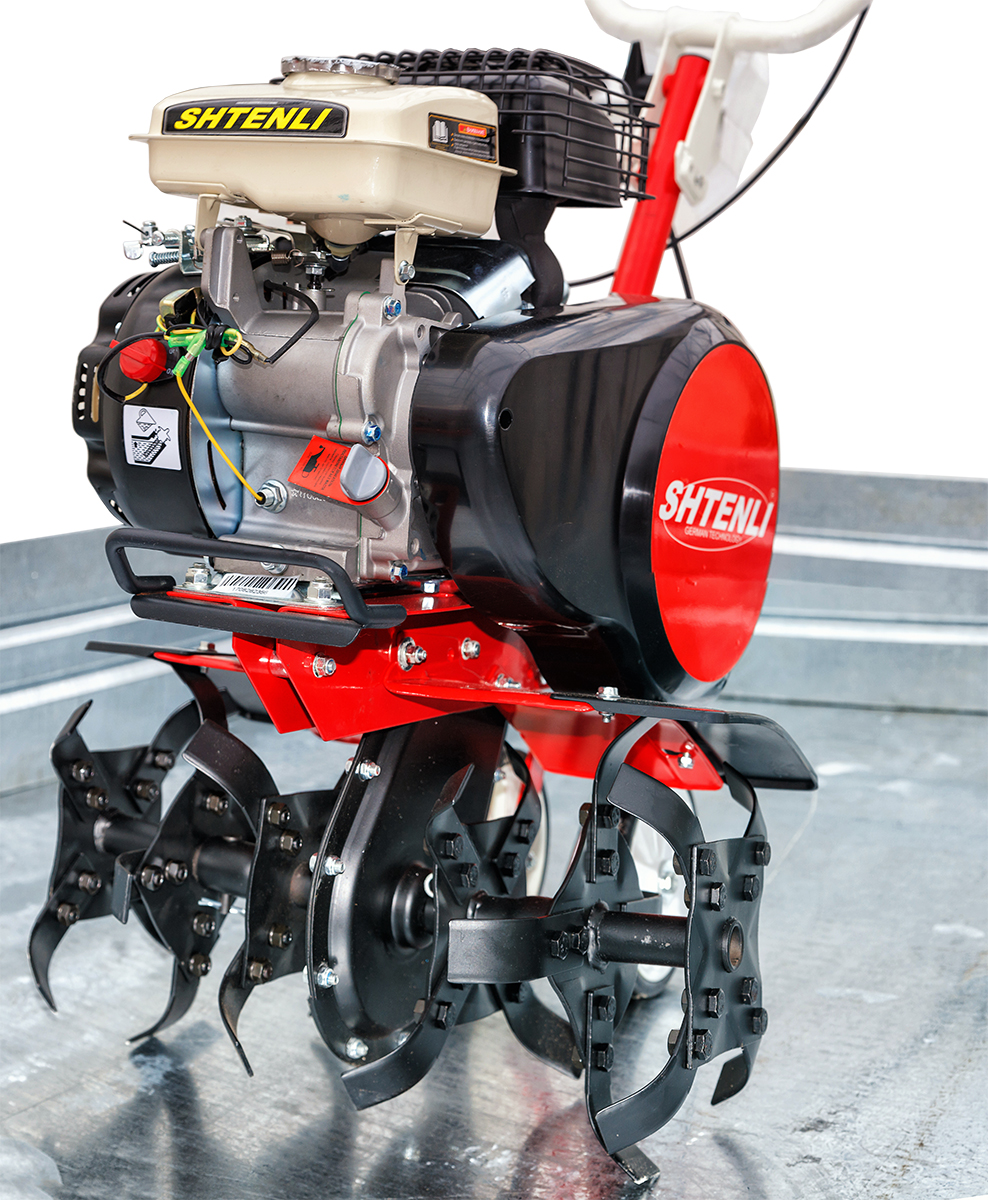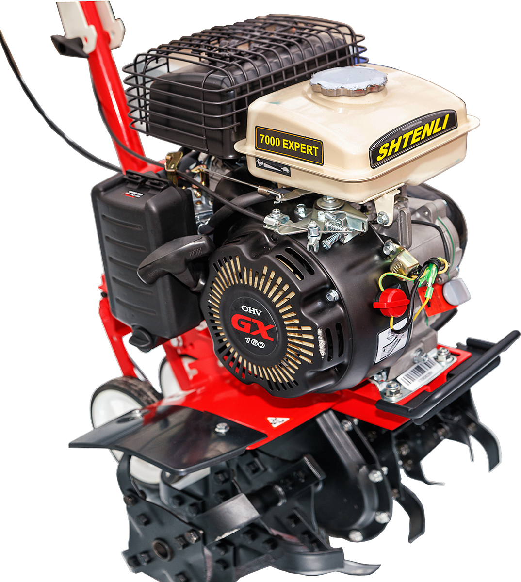 Мотокультиватор Shtenli 7000 Expert - представляет собой самоходную машину для подготовки и обработки почвы под посадку садовых и огородных культур, растений, не предназначен для транспортировки, буксировки или толкания грузов и/или прицепных устройств, приводится в движение бензиновым двигателем мощностью 7,0 л.с., удержание культиватора во время работы и управление им осуществляется идущим за ним оператором за две ручки. Обработка почвы осуществляется ножами фрез (устанавливаются вместо транспортировочных колес), которые при вращении отрезают пласты почвы, крошат и перемешивают их, одновременно вызывая поступательное движение культиватора. Мотокультиватор поставляется без колес. Возможности присоединения навесного оборудования нет. Вала отбора мощности нет.
