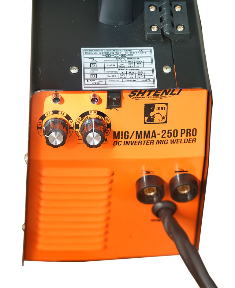 Сварочный аппарат ручной дуговой сварки полуавтоматического типа (двухвариционный) Shtenli MIG/MMA 250 PRO. Аппарат предназначен для проведения сварочных работ проволокой, а также плавящимися электродами. Стабильный провар металла, система антиразбрызгивания металла во время сварки, мощная система выпрямления и выравнивания тока включает фильтр и стабилизатор тока. Имеет встроенный вентилятор охлаждения и плавную регулировку сварочного тока. Сварочный полуавтомат выполняет полный перечень сварочных предпочтений (кроме аргона) и применяется в промышленных целях. Штенли MIG/MMA 250 PRO включает в себя уникальную систему контроля сварочных динамических характеристик; обеспечивает стабильность горения дуги, низкий уровень разбрызгивания металла, прекрасную форму шва, высокую эффективность сварки. Позволяет применять рабочий режим автоматического поддержания / угасания дуги, способного удовлетворить различные требования к сварке. Включает функцию капельного переноса в процессе сварки, обеспечивает высокий уровень напряжения холостого хода, медленную скорость подачи проволоки, практически безотказное возбуждение дуги. Дает возможность проводить как сварку в среде углекислого газа С02 так и сварку штучным электродом диаметром 1.6-4 мм. Позволяет использовать проволоку диаметром 0,6-0,8 мм, как и низколегированную, так и нержавеющую и для специальных сталей.