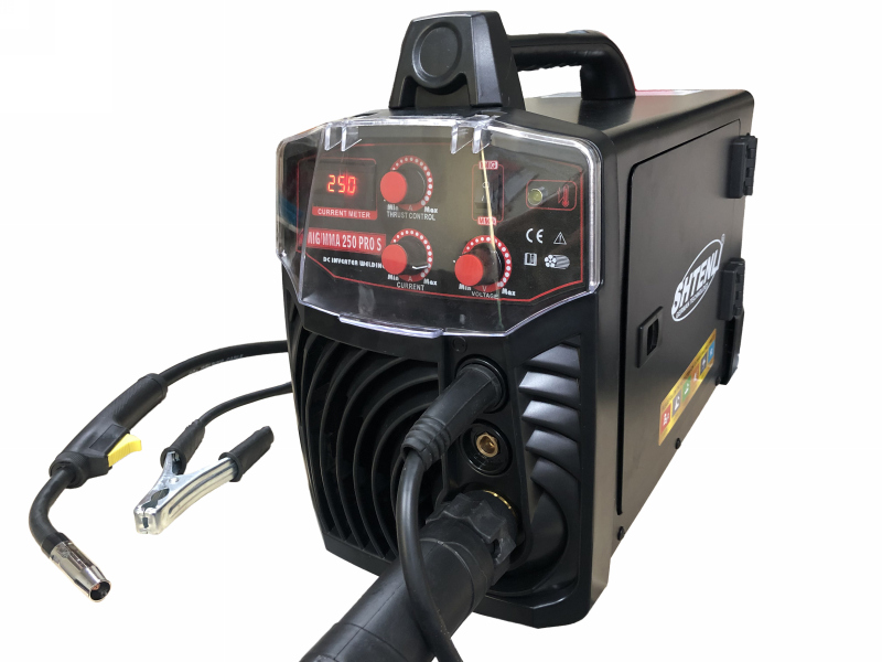 Сварочный аппарат ручной дуговой сварки полуавтоматического типа (двухвариционный) Shtenli MIG/MMA 250 PRO S. Аппарат предназначен для проведения сварочных работ проволокой, а также плавящимися электродами. Стабильный провар металла, система антиразбрызгивания металла во время сварки, мощная система выпрямления и выравнивания тока включает фильтр и стабилизатор тока. Имеет встроенный вентилятор охлаждения и плавную регулировку сварочного тока. Сварочный полуавтомат выполняет полный перечень сварочных предпочтений (кроме аргона) и применяется в промышленных целях. Shtenli MIG/MMA 250 PRO S включает в себя уникальную систему контроля сварочных динамических характеристик; обеспечивает стабильность горения дуги, низкий уровень разбрызгивания металла, прекрасную форму шва, высокую эффективность сварки. Позволяет применять рабочий режим автоматического поддержания / угасания дуги, способного удовлетворить различные требования к сварке. Включает функцию капельного переноса в процессе сварки, обеспечивает высокий уровень напряжения холостого хода, медленную скорость подачи проволоки, практически безотказное возбуждение дуги. Дает возможность проводить как сварку в среде углекислого газа С02 так и сварку штучным электродом диаметром 1,6-4 мм. Позволяет использовать проволоку диаметром 0,6-0,8 мм, как и низколегированную, так и нержавеющую и для специальных сталей.